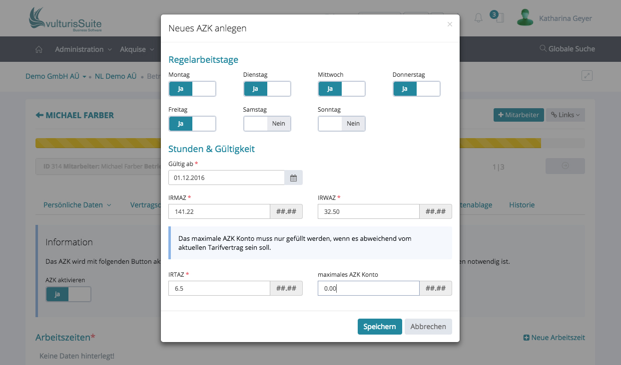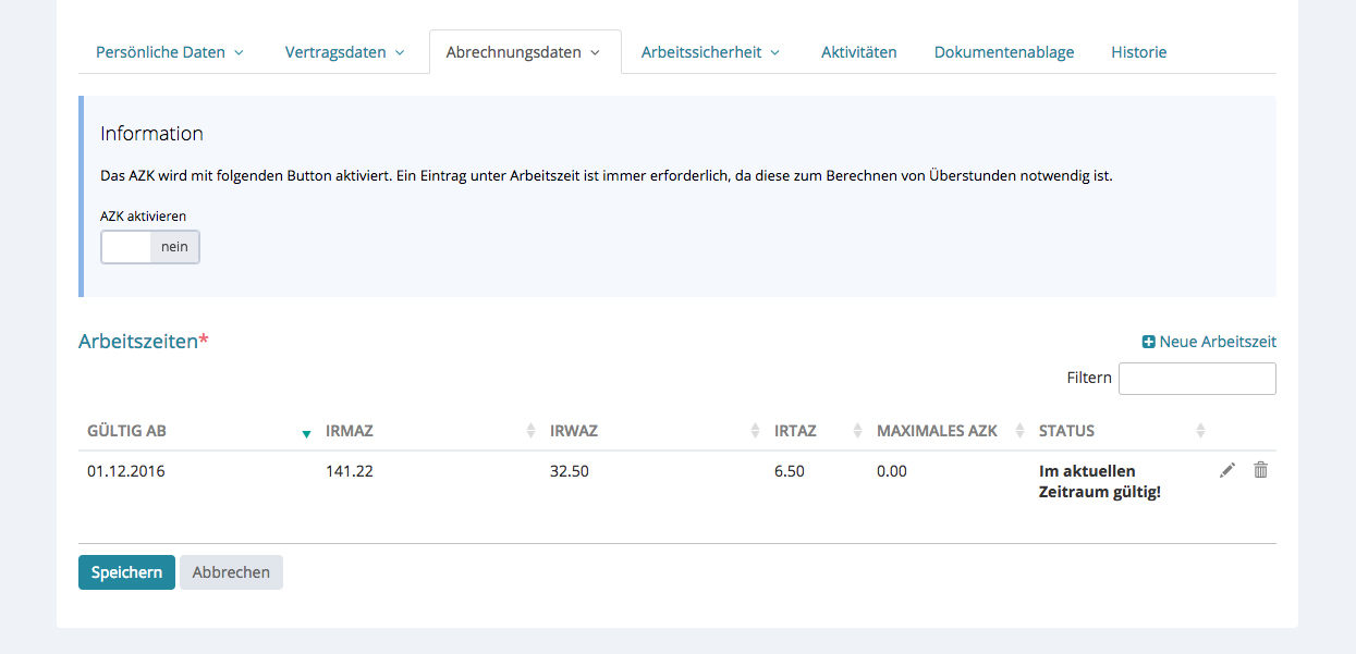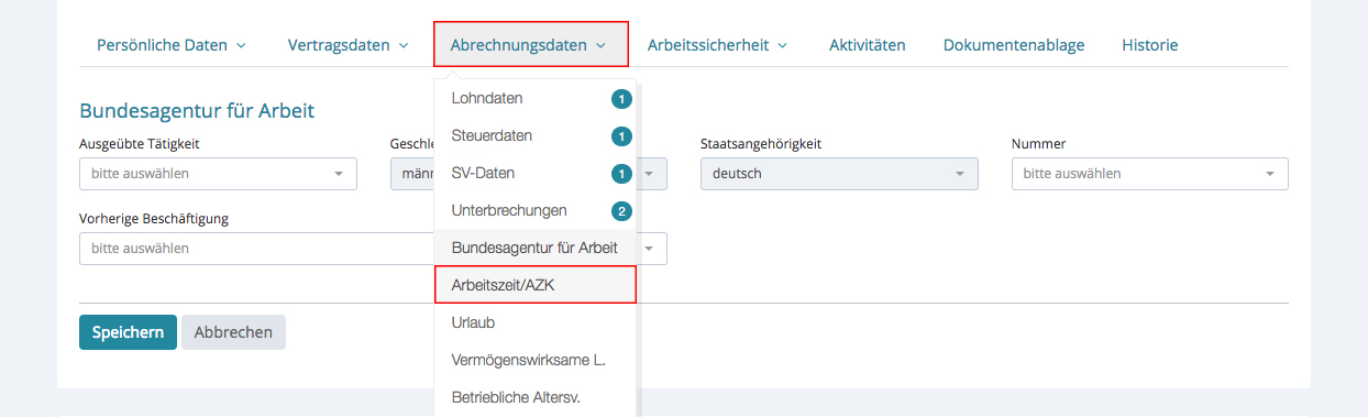 Klicken Sie bitte auf den Pfeil bei „Abrechnungsdaten“ und klicken auf „Arbeitszeit/AZK“.