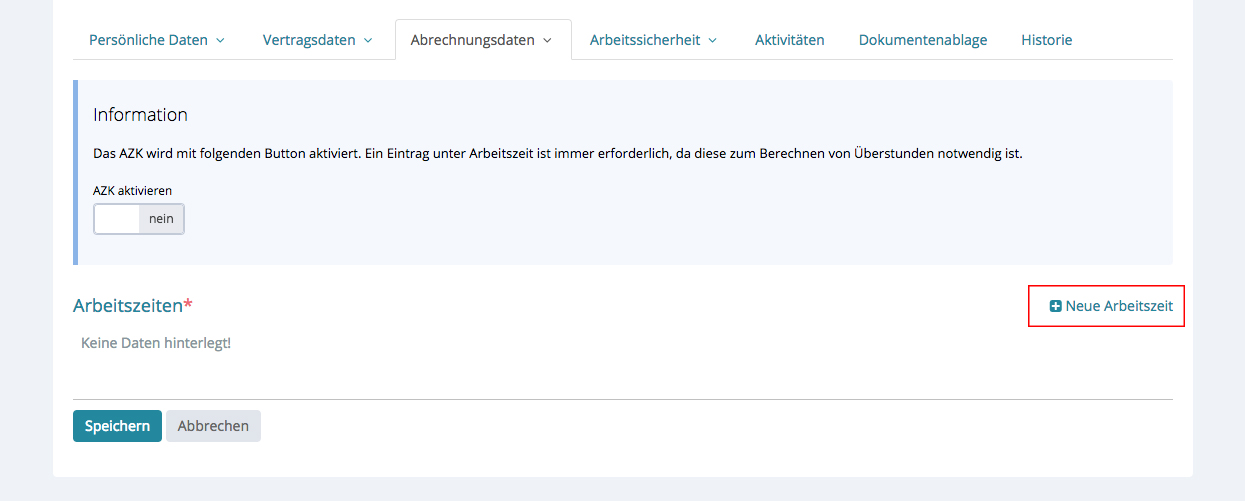 Klicken Sie dann unten rechts auf „+Neue Arbeitszeit“.