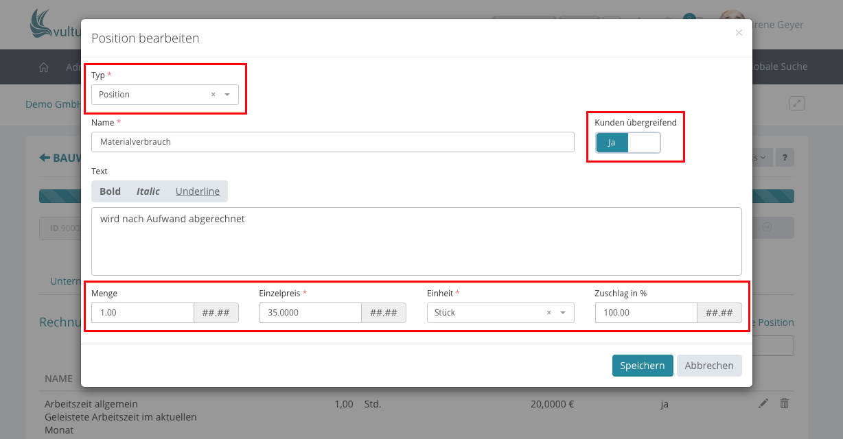Hier können Sie auswählen ob es sich um eine „Position“ handelt, d.h. die Pflichteingabefelder Menge, Einzelpreis, Einheit und Zuschlag in 100% sind eingeblendet.