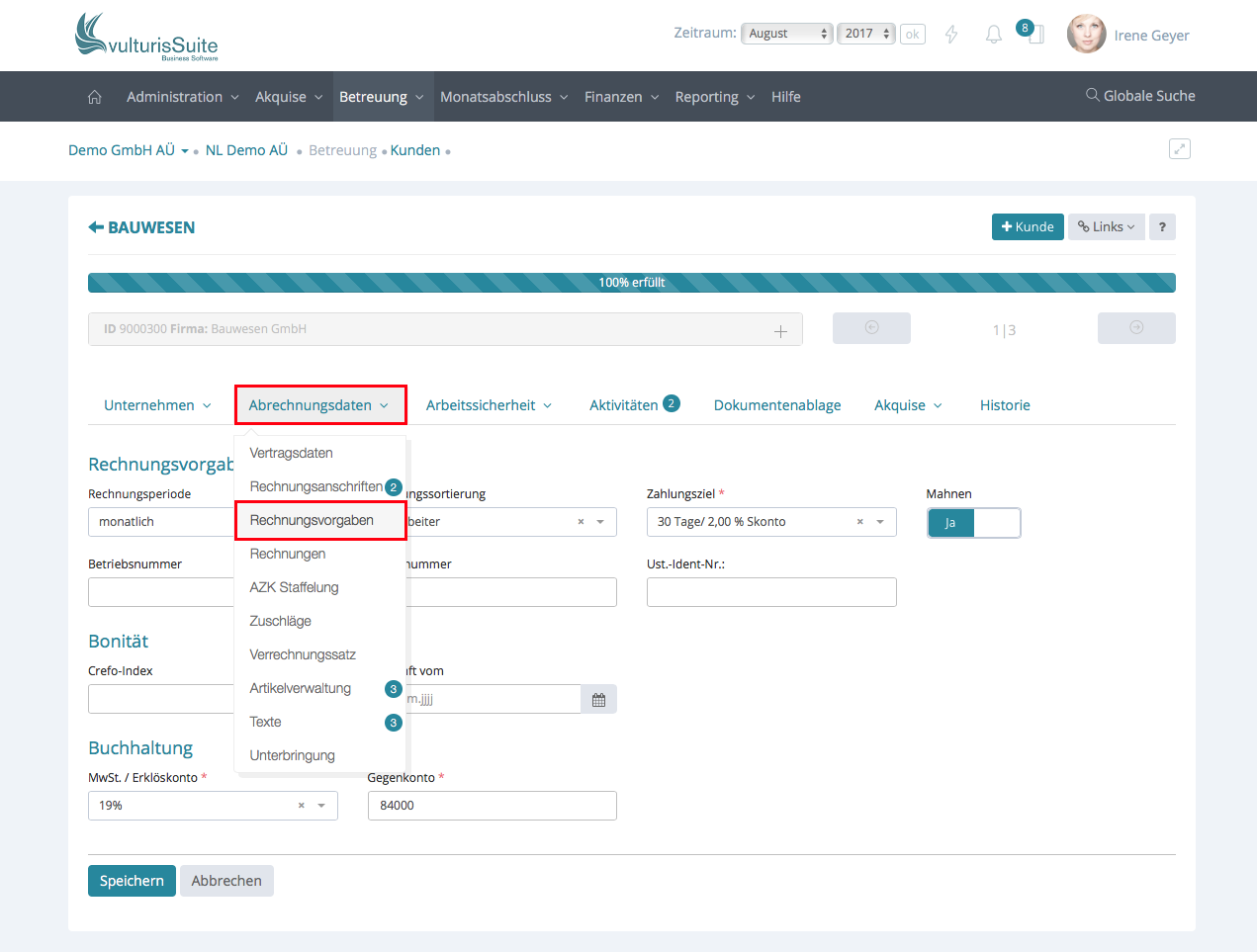 In diesem Formular geben Sie alle buchhalterischen bzw. rechnungsrelevanten Daten für die Rechnungen ein.