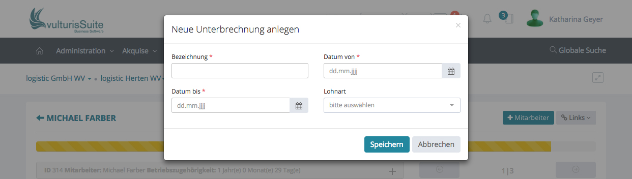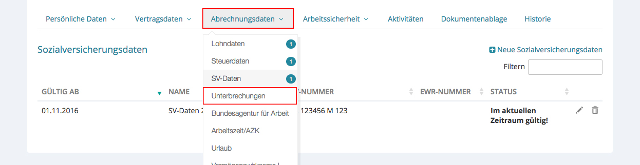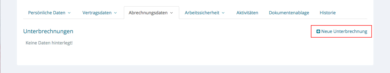 Klicken Sie bitte auf den Pfeil bei „Abrechnungsdaten“ und klicken auf „Unterbrechungen“.