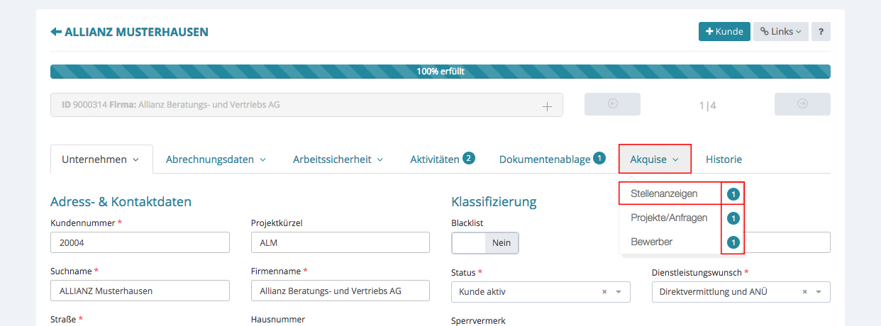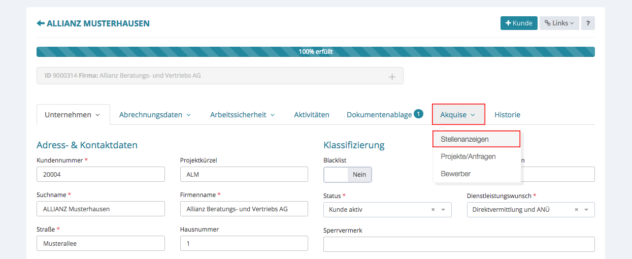Klicken Sie auf den Reiter „Akquise“ und wählen Stellenanzeige.