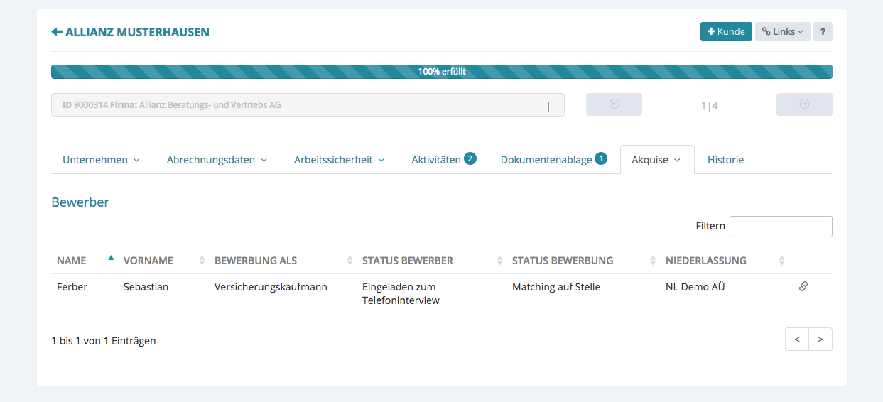 Um zu dem Bewerber selbst zu gelangen klicken Sie auf das Verknüpfungssymbol am Ende der Zeile oder klicken Sie bei Stellenanzeige direkt auf „Bewerber“.