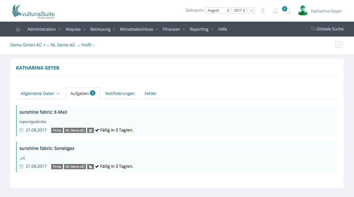 Haben Sie sich die Aufgaben selbst zugewiesen werden diese in Ihrem Notizbuch eingetragen und unter Aufgaben auf Ihrem Dashboard angezeigt. Sie erhalten ebenfalls eine E-Mail zur Erinnerung an dem Tag zu dem die Aufgabe zu erledigen ist.