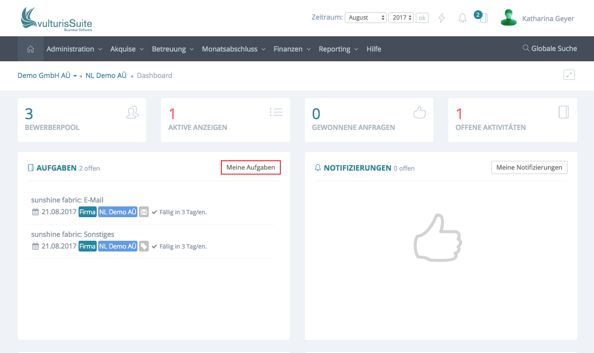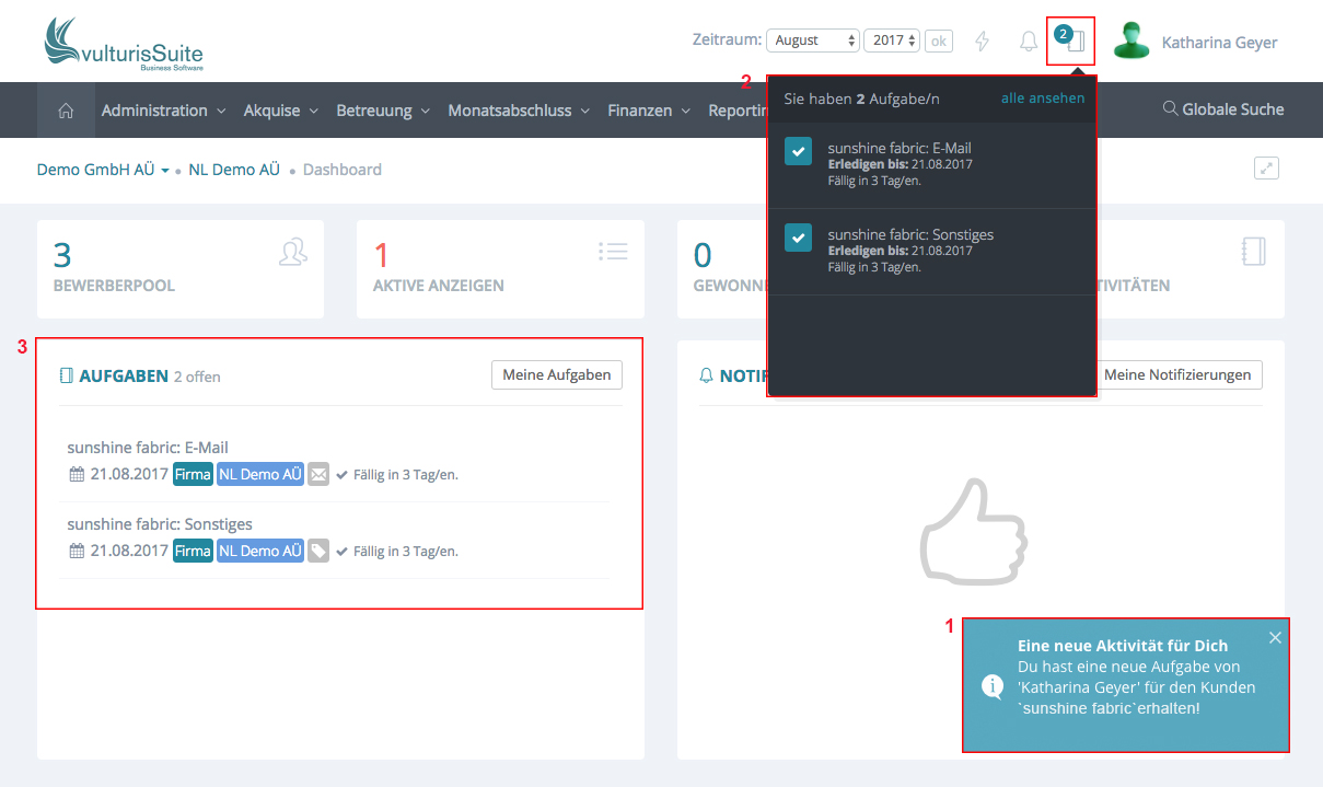 Benachrichtigung auf dem Dashboard unter Aufgaben