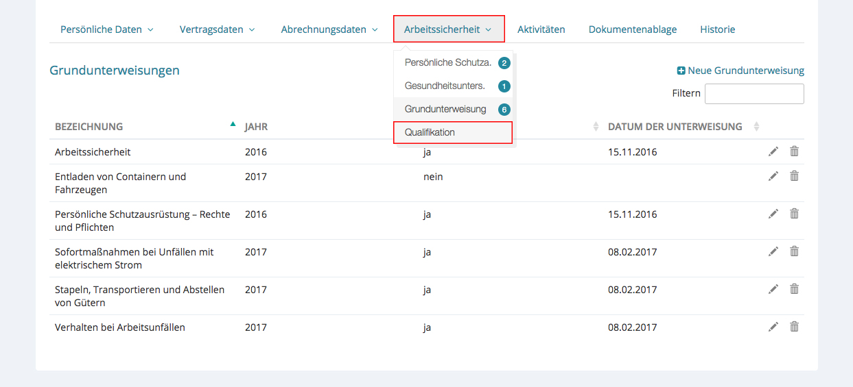 Klicken Sie bitte auf den Pfeil bei „Arbeitssicherheit“ und klicken auf „Qualifikationen“.