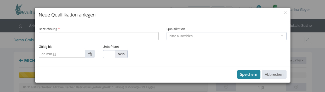 Tragen Sie die Bezeichnung der Qualifikation ein und wählen (falls vorhanden) eine dazu gehörige Qualifikation aus der Liste aus. Tragen Sie auch ein, ob diese zeitlich begrenzt ist und regelmäßig erneuert werden muss, oder ob es sich um eine unbefristete Qualifikation handelt.