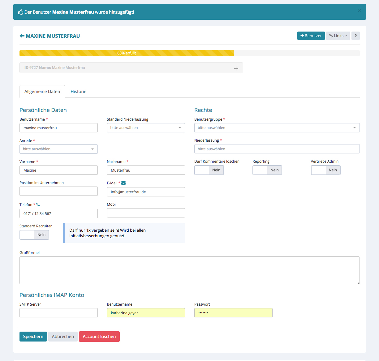 Hier können Sie ihr IMap-Konto (imap.1und1.de) mit den persönlichen Zugangsdaten hinterlegen. Wenn diese hinterlegt sind, werden sämtliche E-Mails mit dieser Adresse als Absender verschickt. Sind hier keine Daten hinterlegt, werden die E-Mails mit einem Standard-Account versendet.