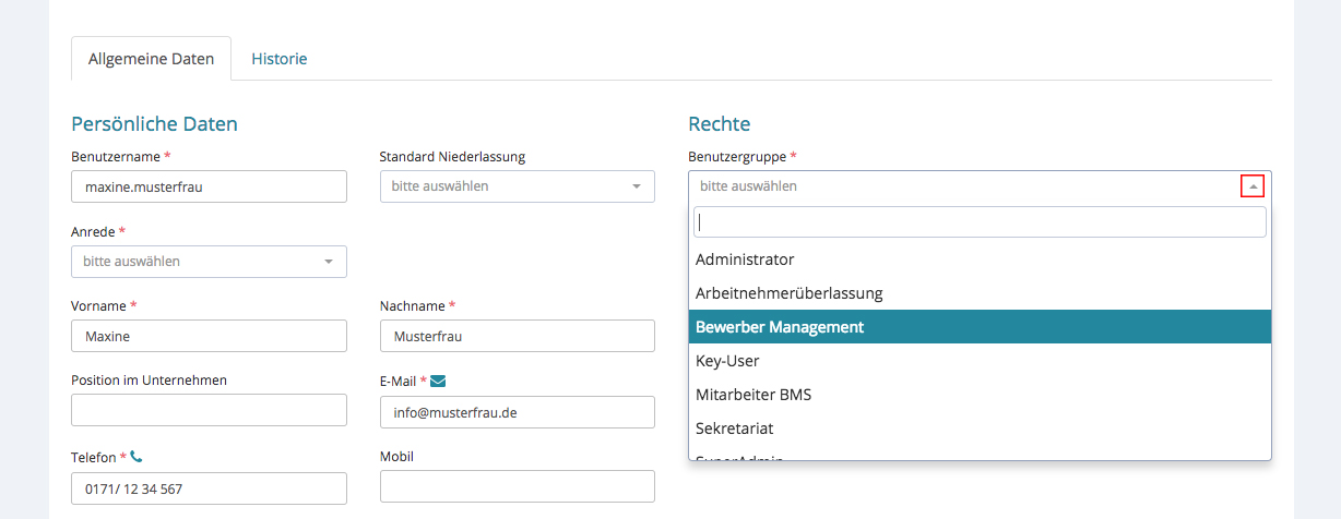 Klicken Sie in das Feld und Ihnen werden alle bis dahin hinterlegten Benutzergruppen angezeigt. Ist die gewünschte Benutzergruppe nicht hinterlegt, kann diese über „Benutzergruppe neu anlegen“ von einem Administrator angelegt werden.