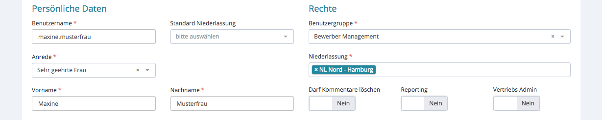 Natürlich können auch einem Benutzer mehrere Niederlassungen freigegeben werden. Dazu einfach noch Mal ins Feld klicken und die nächste Niederlassung auswählen. Es können soviel Niederlassungen ausgewählt werden wie hinterlegt sind.