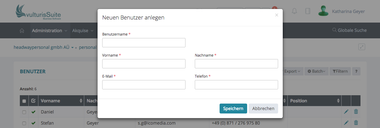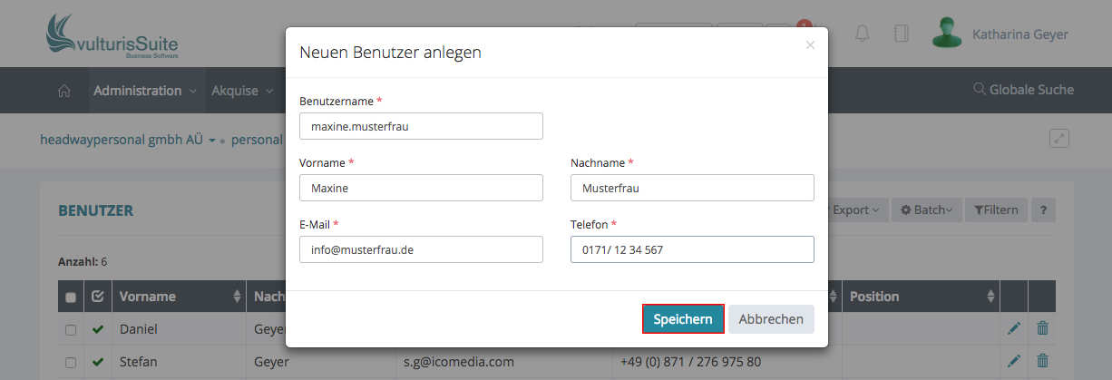 Ein Klick auf den Button „+Benutzer“ und ein Schnelleingabefenster erscheint.