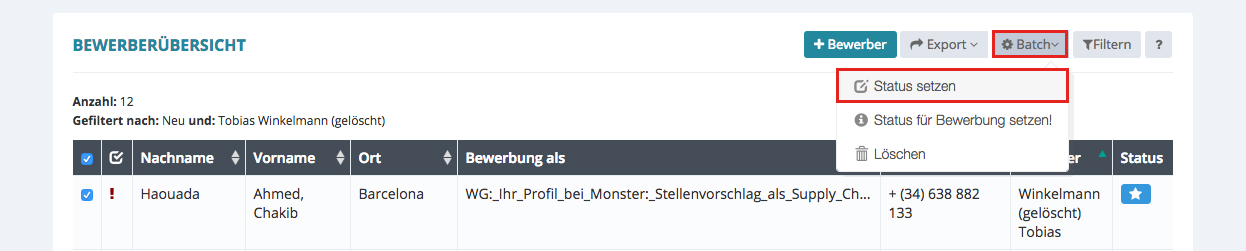 Klicken Sie jetzt in das Feld „Status des Bewerbers“ und wählen den Status „Neu“ aus, um die Auswahl weiter einzugrenzen, wählen Sie sich noch als Recruiter aus und klicken auf „Filtern“.