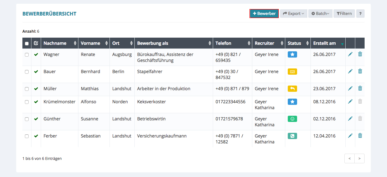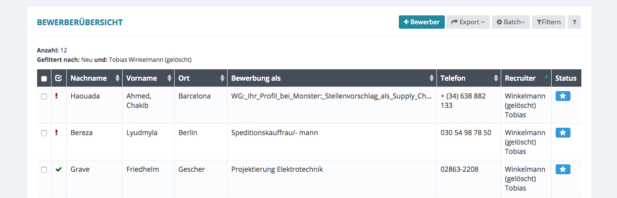 Hier werden Ihnen eingetragenen Bewerber angezeigt, ausgenommen die Bewerber mit dem Status „nicht mehr verfügbar“ und „Abgesagt“. Diese Bewerber sind aber über die Filterfunktion zu finden.