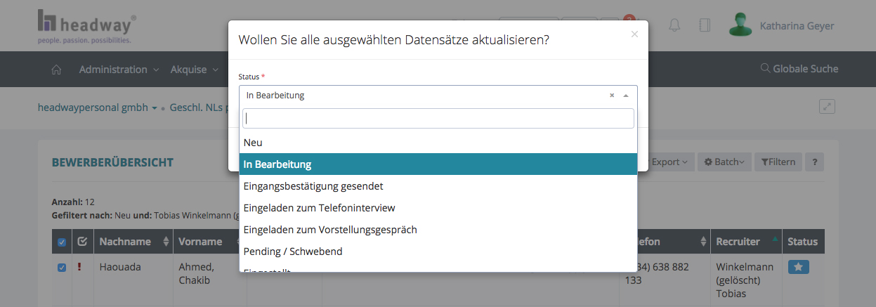 Bei jedem ausgewählten Bewerber wird nun der Status auf „In Bearbeitung“ gesetzt.