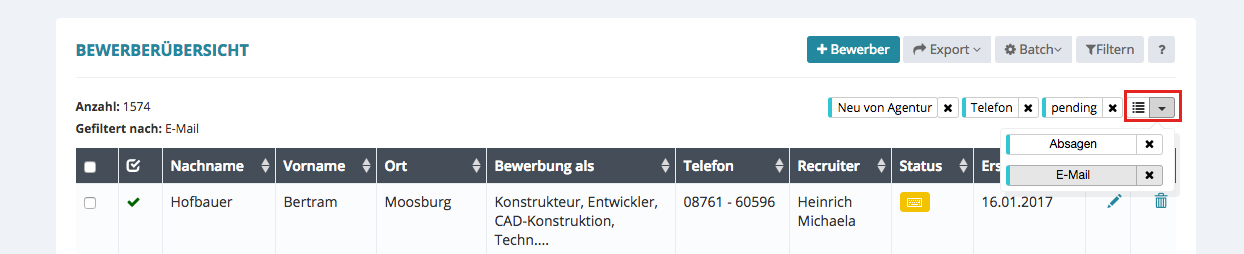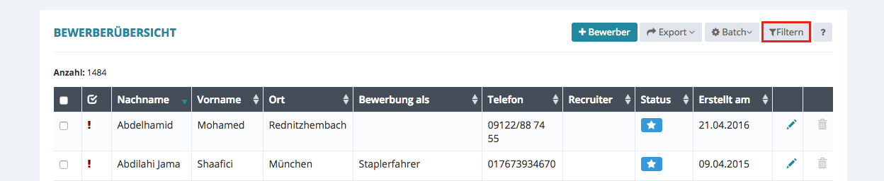 Sie können die Bewerberübersicht auf sehr viele Arten filtern/durchsuchen. Klicken Sie dazu oben rechts auf den Button „Filtern“.