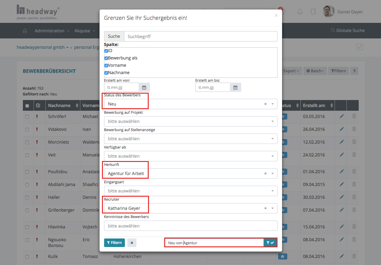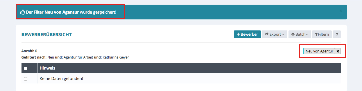 Wenn Sie regelmäßig mit dem Filter nach dem Gleichen suchen, z.B. jeden Morgen nach neuen Bewerbern, die Ihnen zugeteilt sind und über die Agentur für Arbeit kamen, dann wählen Sie diese Filter alle aus und vergeben, ganz unten rechts, einen Namen und klicken auf das nebenstehende Häkchen.