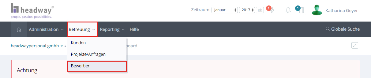 Um zu der Listenansicht der Bewerber zu gelangen, klicken Sie bitte in der Menüleiste auf Betreuung -> Bewerber.