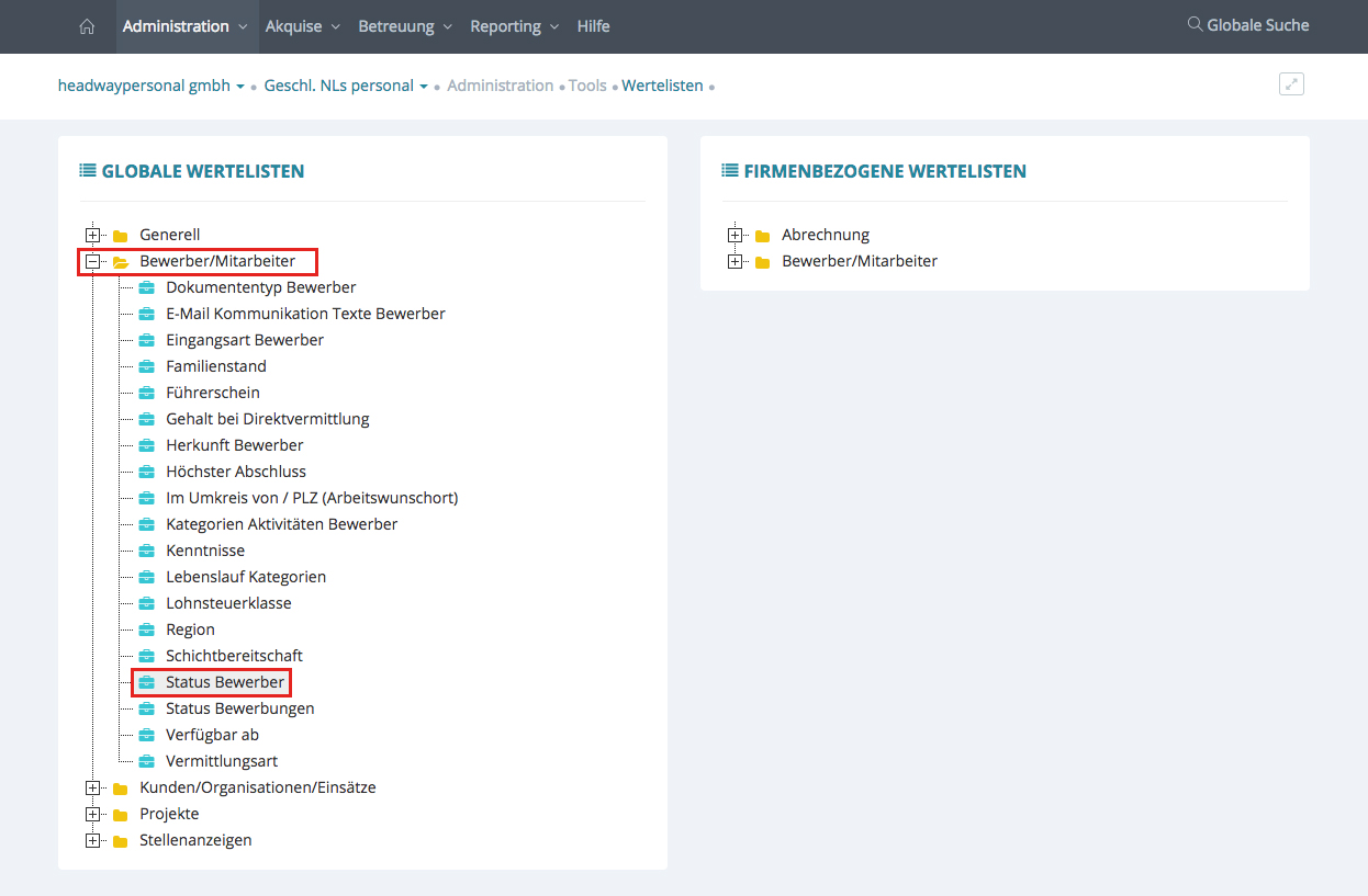 Jetzt wählen Sie in der Globalen Werteliste den Ordner „Bewerber/Mitarbeiter“ aus und anschließend „Status Bewerber“