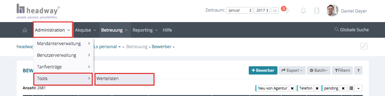 Um die Einstellung anzulegen klicken Sie in der Menüleiste auf Administration, dann auf Tools und anschließend auf Wertelisten.
