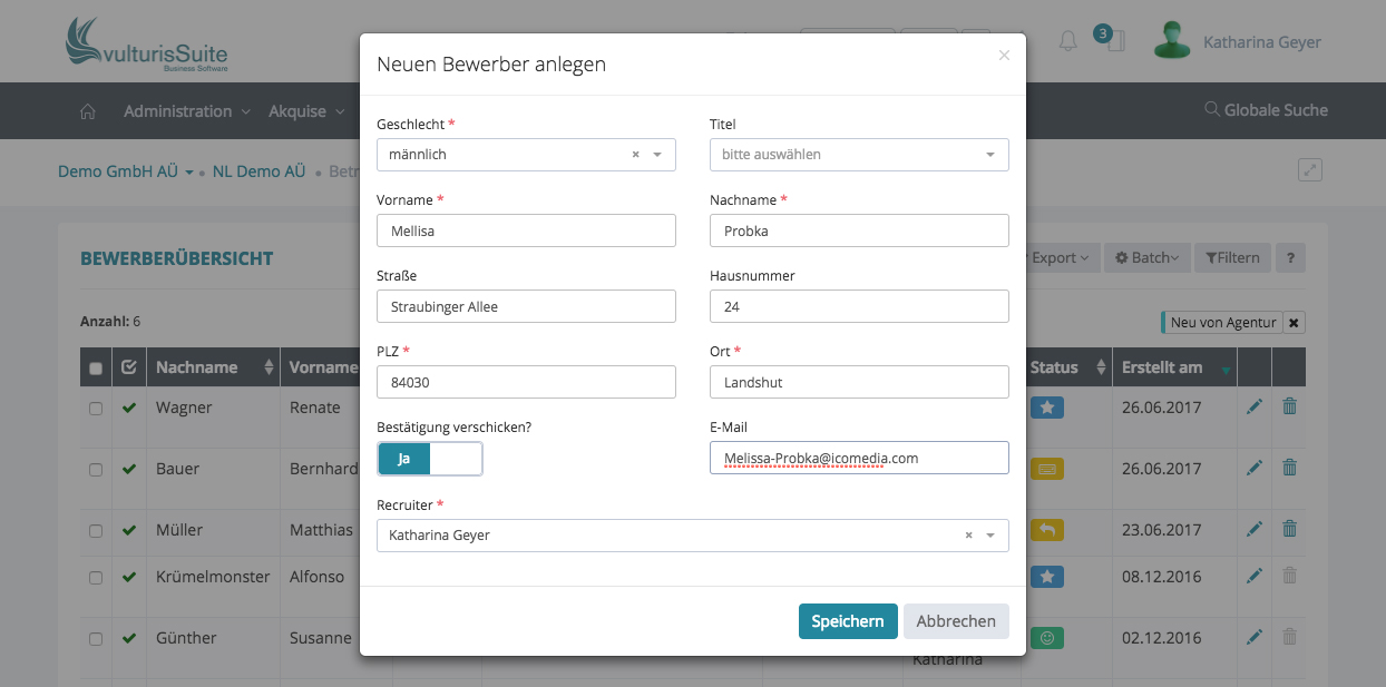 Ein Klick auf den Button „+Bewerber“ und ein Schnelleingabefenster erscheint.