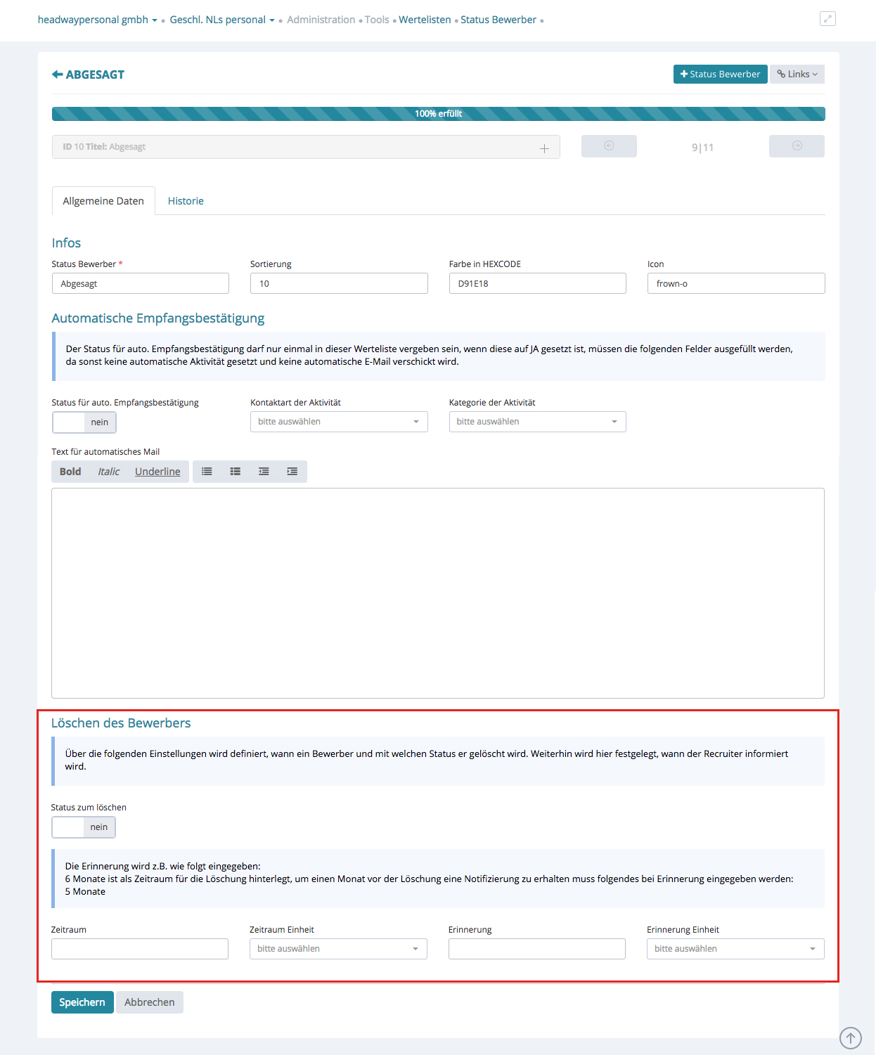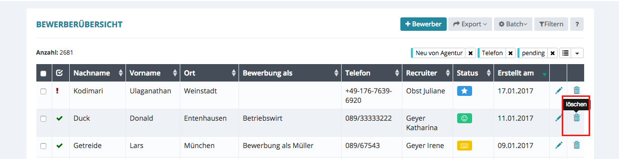 Diesen in der Bewerberübersicht manuell zu löschen, indem man auf den Papierkorb klickt.