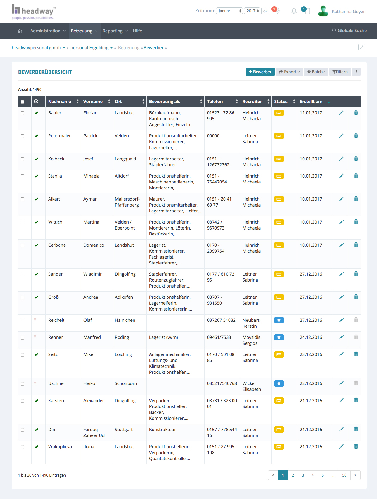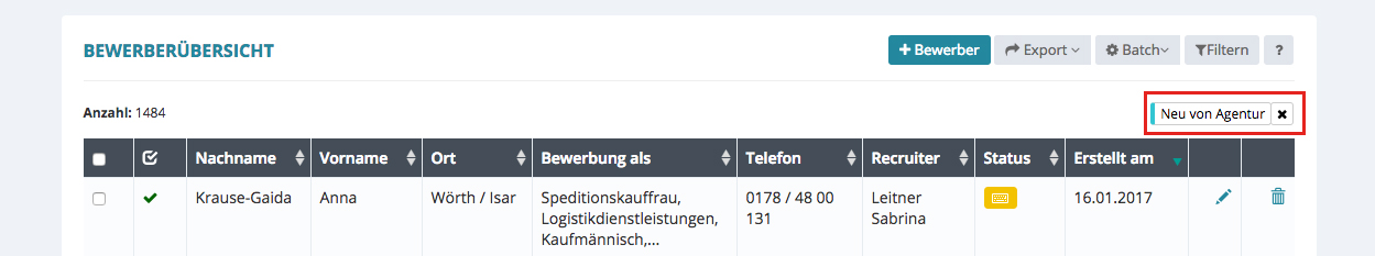 Hier werden Ihnen eingetragenen Bewerber angezeigt, ausgenommen die Bewerber mit dem Status „nicht mehr verfügbar“ und „Abgesagt“. Diese Bewerber sind aber über die Filterfunktion zu finden.