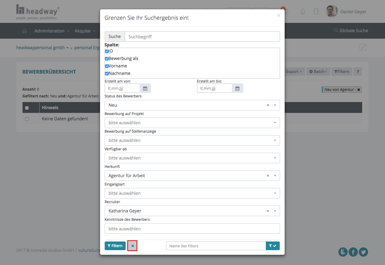 Sie können die Bewerberübersicht auf sehr viele Arten filtern/durchsuchen. Klicken Sie dazu oben rechts auf den Button „Filtern“.