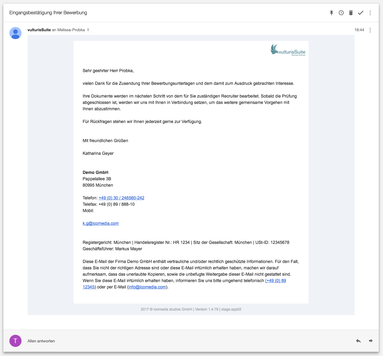 Wenn Sie möchten, das der Bewerber sofort eine Bestätigungsmail, über den Eingang seiner Unterlagen erhält, klicken Sie bei „Bestätigung verschicken?“ auf „Ja“ und tragen die E-Mail Adresse ein. Der Bewerber erhält dann folgende Mail: