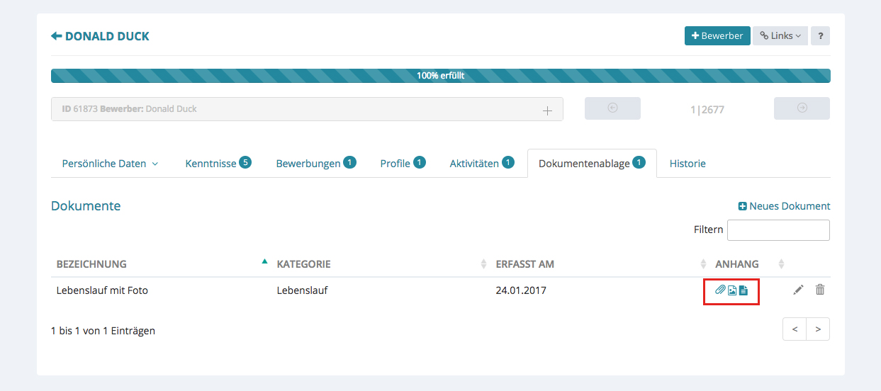 Das Dokument erscheint nun in der Übersicht. Es kann per Klick auf die Büroklammer angesehen werden, mit dem Stift bearbeitet werden und durch den Papierkorb gelöscht werden. Ebenso wird Ihnen neben dem Reiter „Dokumentenablage“ die Anzahl der hinterlegten Dokumente angezeigt.