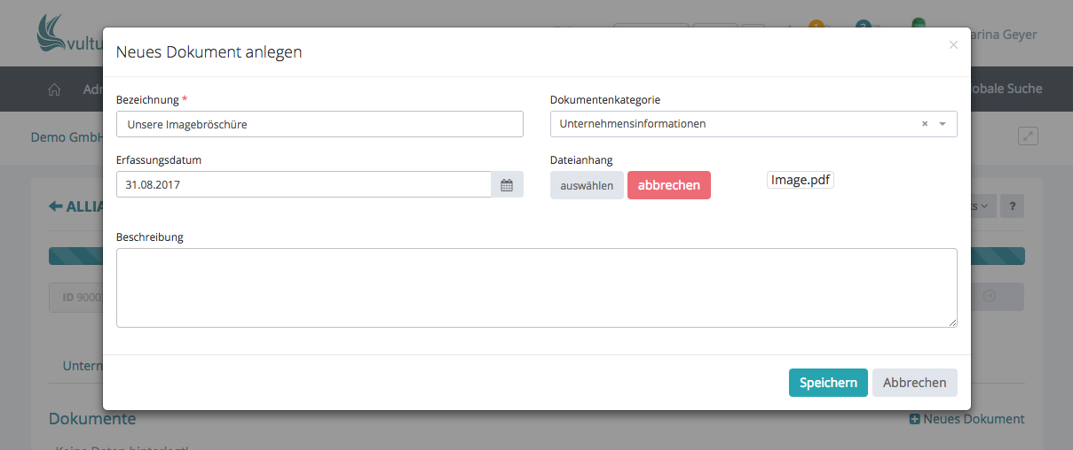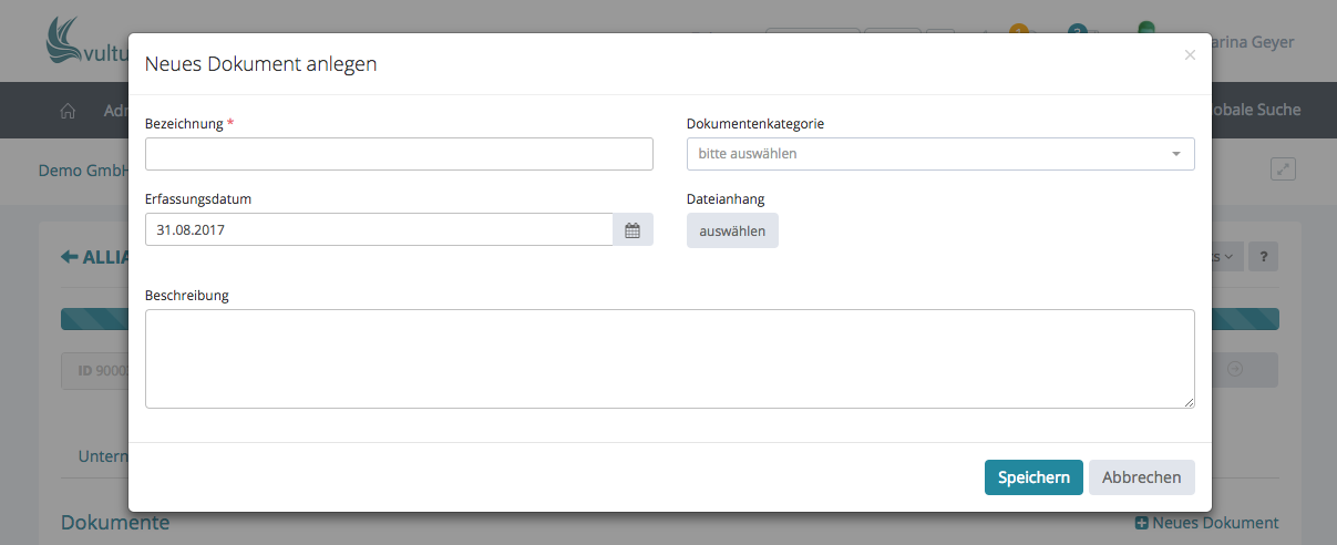 Als erstes vergeben Sie bitte einen Namen für das Dokument und ordnen es der passenden Kategorie zu. Anschließend das Datum eintragen, wann es verschickt wurde. (Benötigen Sie Hilfe bei der Kalenderfunktion, schauen Sie sich an, wie die Datumseingabe funktioniert.) Mit einem Klick auf Dateianhang auswählen können Sie das Dokument hochladen (nur eins pro Vorgang und nicht größer als 5 MB). Geben sie gerne noch eine kurze Beschreibung ein und klicken anschließend auf Speichern. Möchten Sie mehrere Dokumente gleichzeitig hochladen, wird Ihnen hier der Vorgang erklärt: Aktivitäten – E-Mail direkt ans System weiterleiten