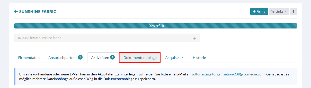 Hier werden alle Dokumente nach der entsprechenden Kategorie gespeichert. In dieser tauchen auch die Dokumente auf, welche bei Aktivitäten als Mail-Anhang verschickt wurden.