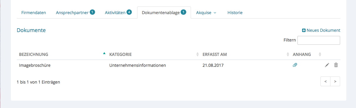 Das Dokument erscheint nun in der Übersicht. Es kann per Klick auf die Büroklammer angesehen werden, mit dem Stift bearbeitet werden und durch den Papierkorb gelöscht werden. Ebenso wird Ihnen neben dem Reiter „Dokumentenablage“ die Anzahl der hinterlegten Dokumente angezeigt.