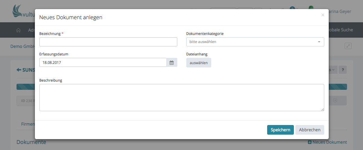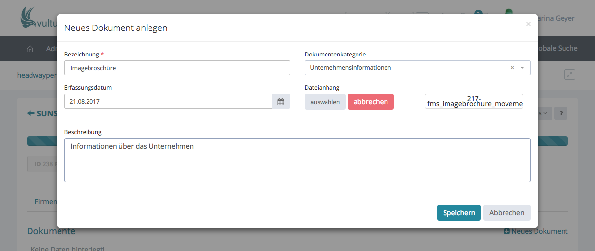 Als erstes vergeben Sie bitte einen Namen für das Dokument und ordnen es der passenden Kategorie zu. Anschließend das Datum eintragen, wann es erfasst wurde. (Benötigen Sie Hilfe bei der Kalenderfunktion, schauen Sie sich an, wie die Datumseingabe funktioniert.) Mit einem Klick auf Dateianhang auswählen können Sie das Dokument hochladen (nur eins pro Vorgang und nicht größer als 5 MB). Geben sie gerne noch eine kurze Beschreibung ein und klicken anschließend auf Speichern. Möchten Sie mehrere Dokumente gleichzeitig hochladen, wird Ihnen hier der Vorgang erklärt: Aktivitäten – E-Mail direkt ans System weiterleiten