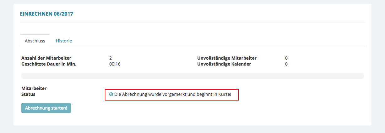 Es erscheint der Satz: „Die Abrechnung wurde vorgemerkt und beginnt in Kürze!“ Da alle Datensätze im Hintergrund regelmäßig via Server eingerechnet werden, kann der Beginn des Einrechnens bis zu maximal 5 Minuten dauern. Die Dauer richtet sich nach der Anzahl der Mitarbeiter.