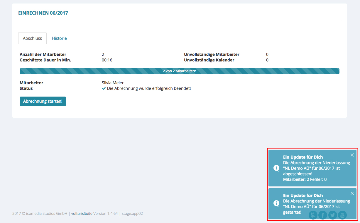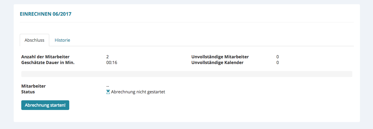 Ist der Zeitraum richtig und alle Mitarbeiter vollständig, kann auf „Abrechnung starten!“ geklickt werden.