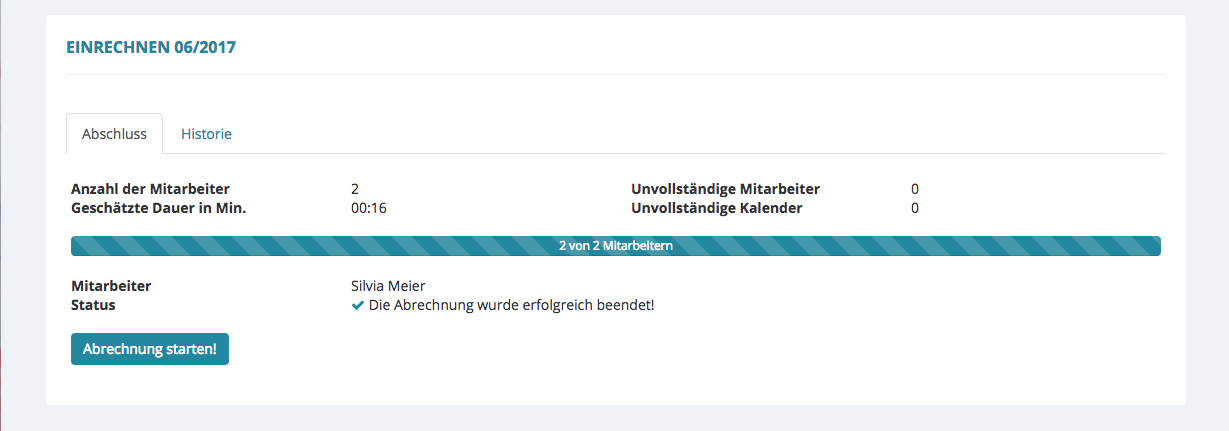 Ist der Balken komplett Petrol gefüllt ist die Abrechnung erfolgreich beendet. Der Name in der Zeile Mitarbeiter, steht für den letzten Mitarbeiter, der von der Liste abgerechnet wurde.
