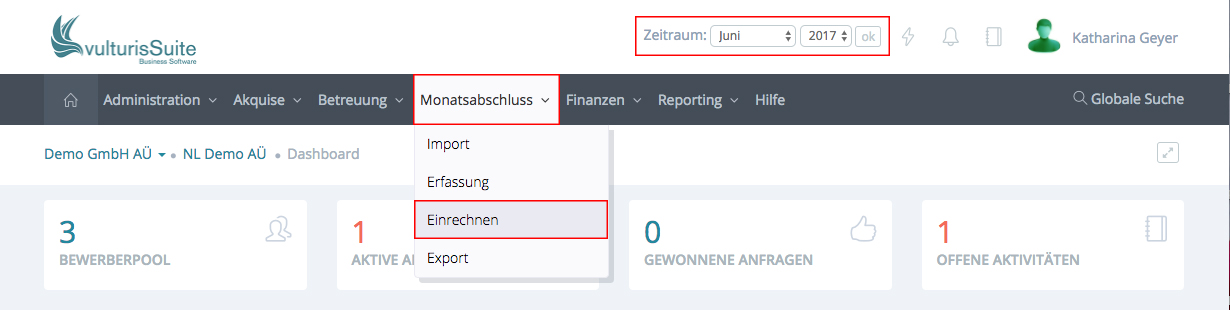 Jeder Zeitraum kann beliebig oft eingerechnet werden, z.B. für Zwischenergebnisse. Wird beim Export, der Monat abgeschlossen, kann dieser dort gesperrt werden, so das keine weitere Abrechnung für diesen Zeitraum mehr erfolgen kann. Wie das geht, erfahren Sie im Artikel zum Export.