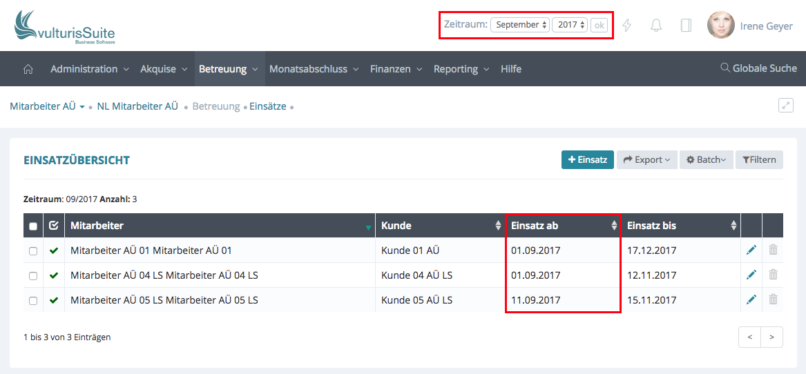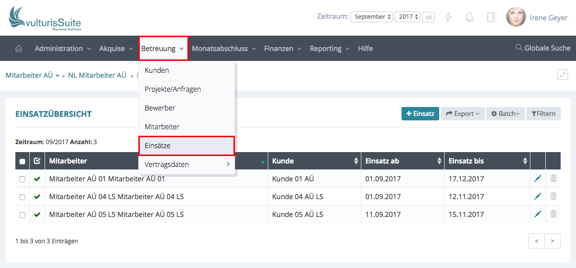 Unter dem Menüpunkt Betreuung befindet sich der Punkt Einsätze.