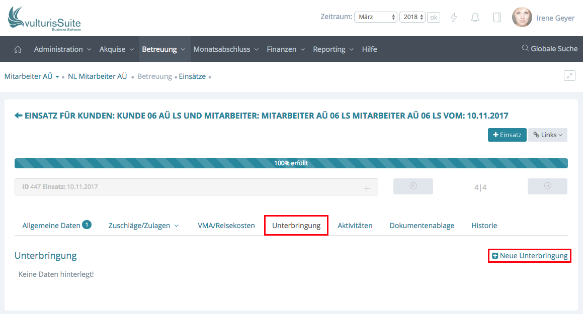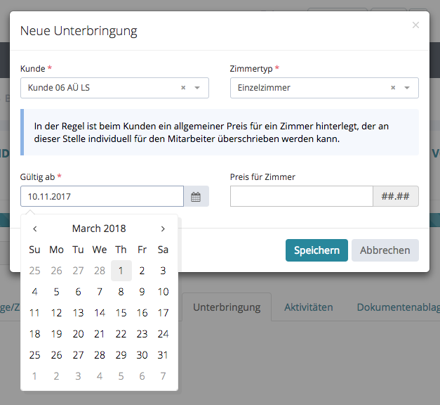 Ein Klick auf den Button „+ Neue Unterbringung“ und ein Eingabefenster erscheint.