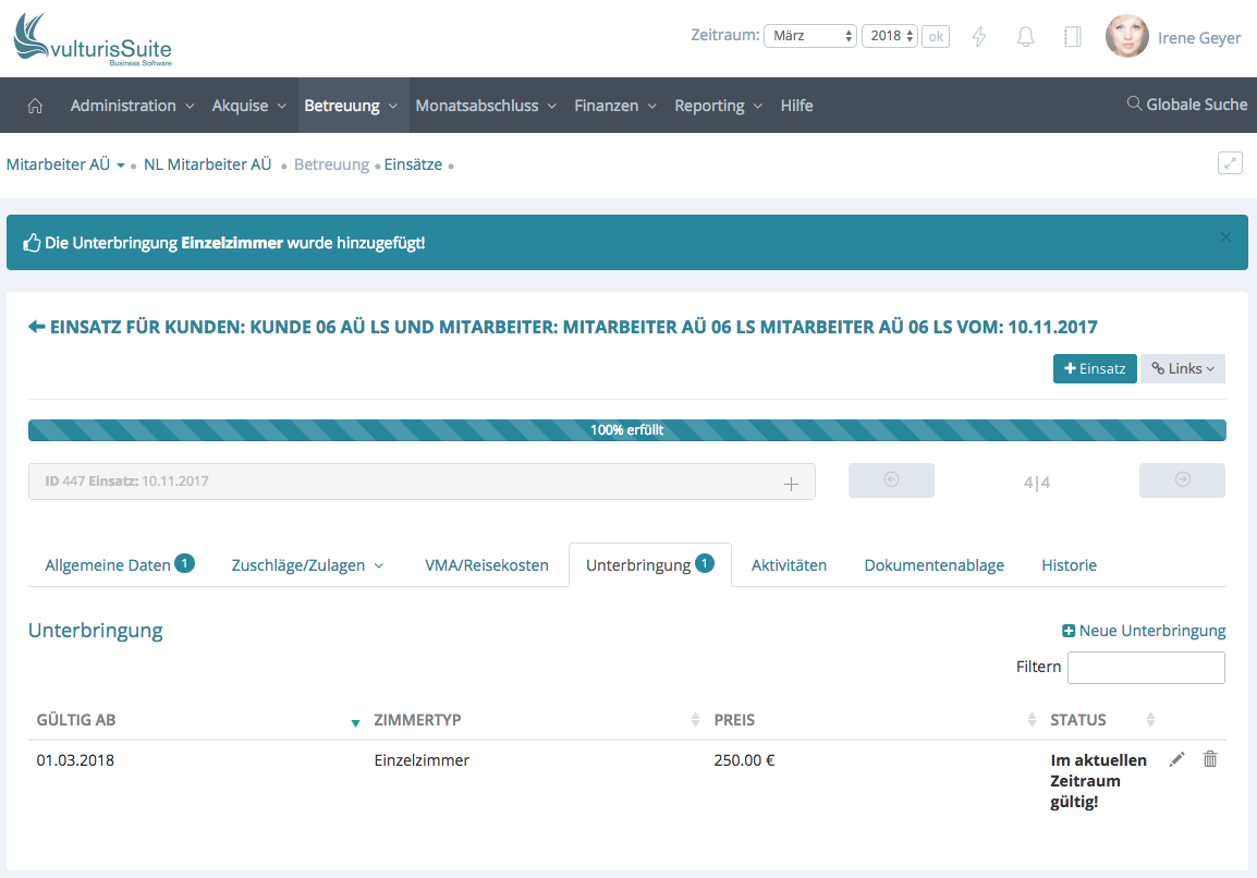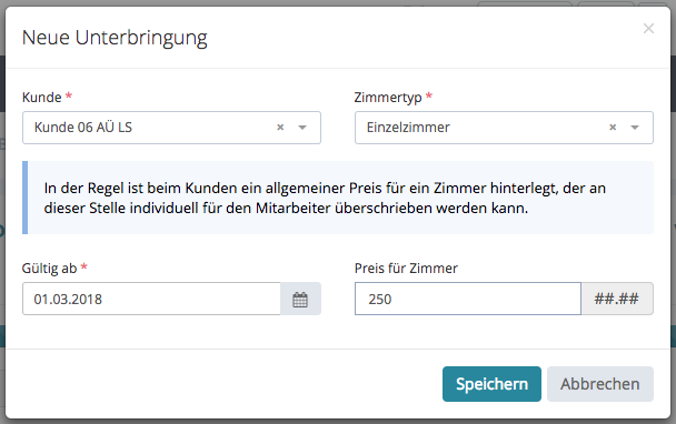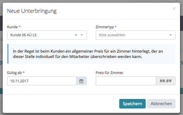 Jetzt können Sie noch einen individuellen Preis für die Unterbringung einsetzten, wenn nicht, wird der Preis verwendet der vorab beim Kunden unter ABRECHNUNGSDATEN: UNTERBRINGUNG hinterlegt wurde.