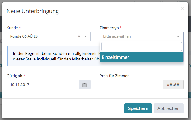 Wählen Sie den Zimmertyp aus, der vorab beim Kunden hinterlegt wurde. ABRECHNUNGSDATEN: UNTERBRINGUNG