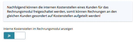Hier können Sie die interne Kostenstelle eines Kunden für das Rechnungsmodul freischalten.