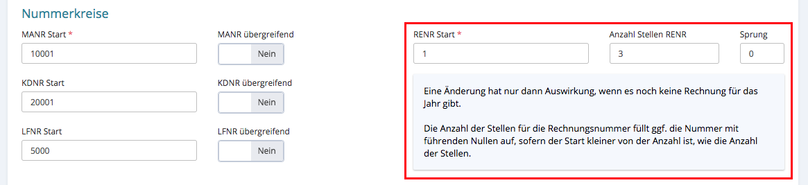 Rechnungsnummern Start, diese Nummer wird vergeben, wenn die 1. Rechnung im Jahr geschrieben wird. Nach dem Jahreswechsel fängt die Zählung von Neuem an, deshalb empfehlen wir eine Änderung dieser Felder erst, wenn die letzte Rechnung im aktuellen Jahr geschrieben ist.