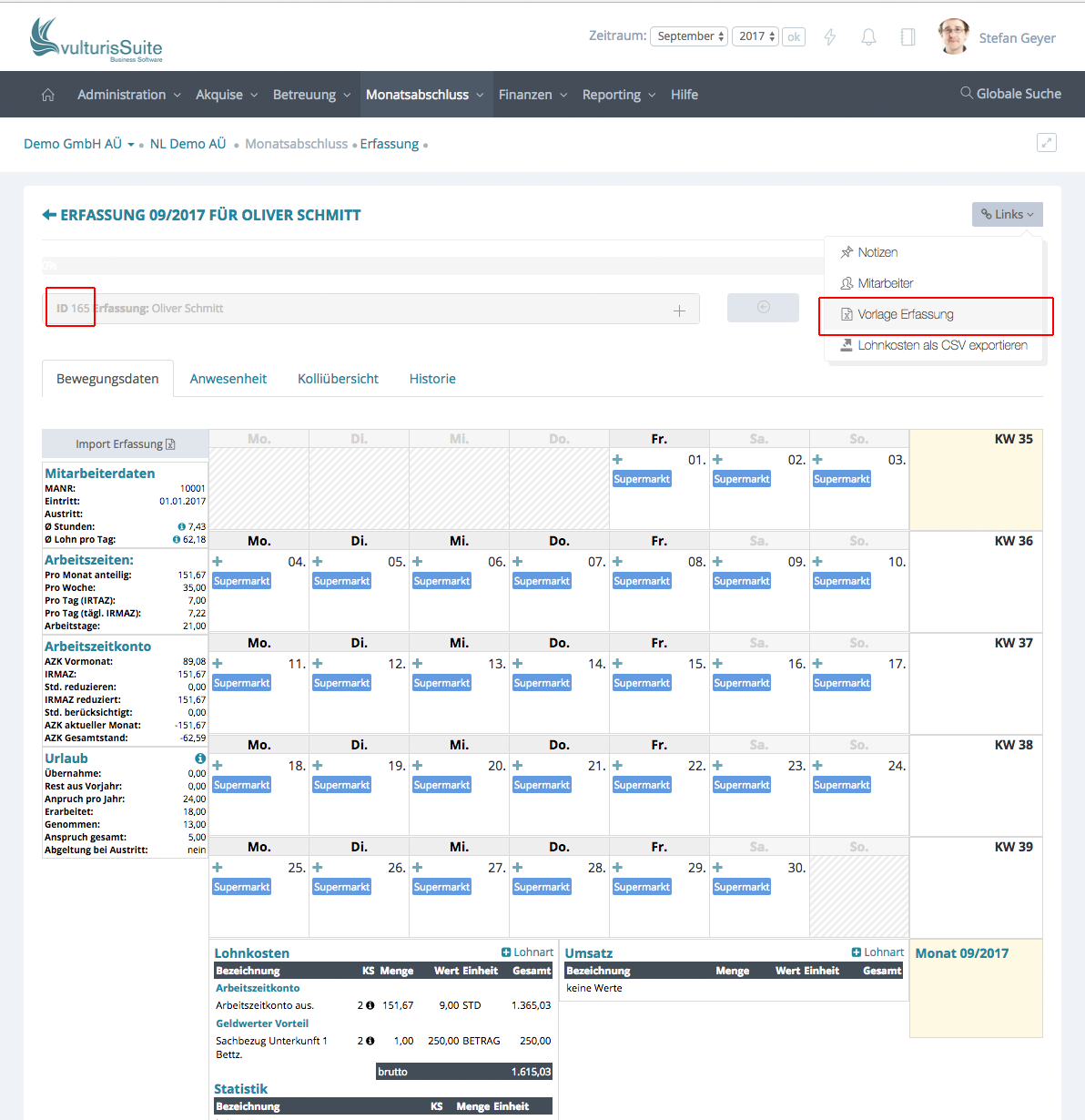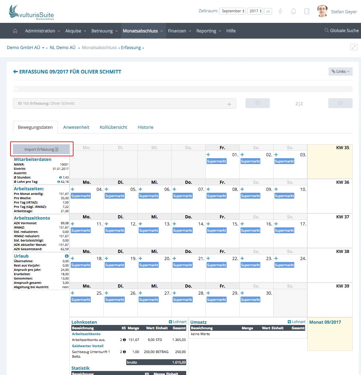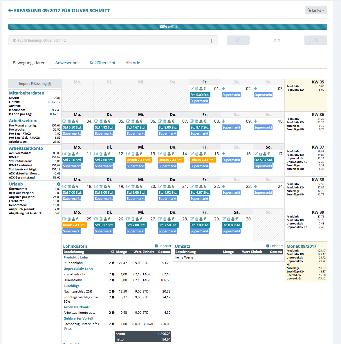 9. Nach dem Klick auf Import, erhalten Sie den komplett gefüllten Kalender und den dazugehörigen Lohn.