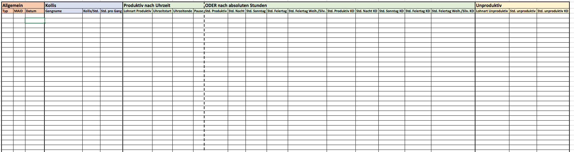 - Spalte 4 = Lohnart Produktiv. Hier bitte die Lohnart für die Produktivzeit reinschreiben. In diesem Fall „Stundenlohn“, es könnte z. B. auch eine Lohnart „Arbeitszeit“ sein.