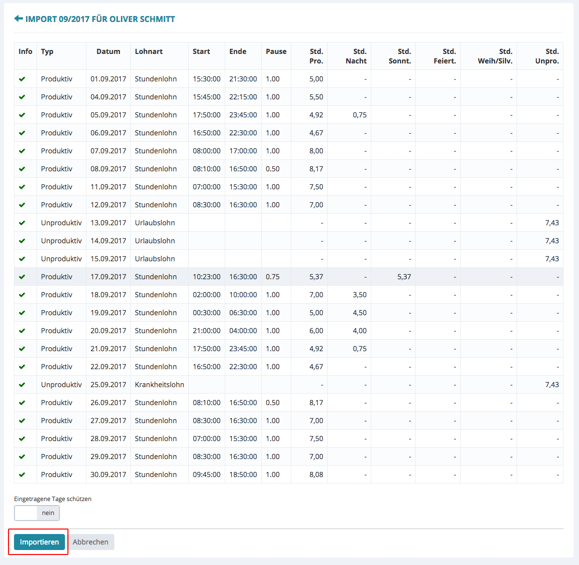 - Der Schalter „Eingetragene Tage schützen“ = Ja, falls einzelne Tage oder Woche schon für den Mitarbeiter erfasst sind, werden nur Daten für die NICHT erfassten Tage importiert