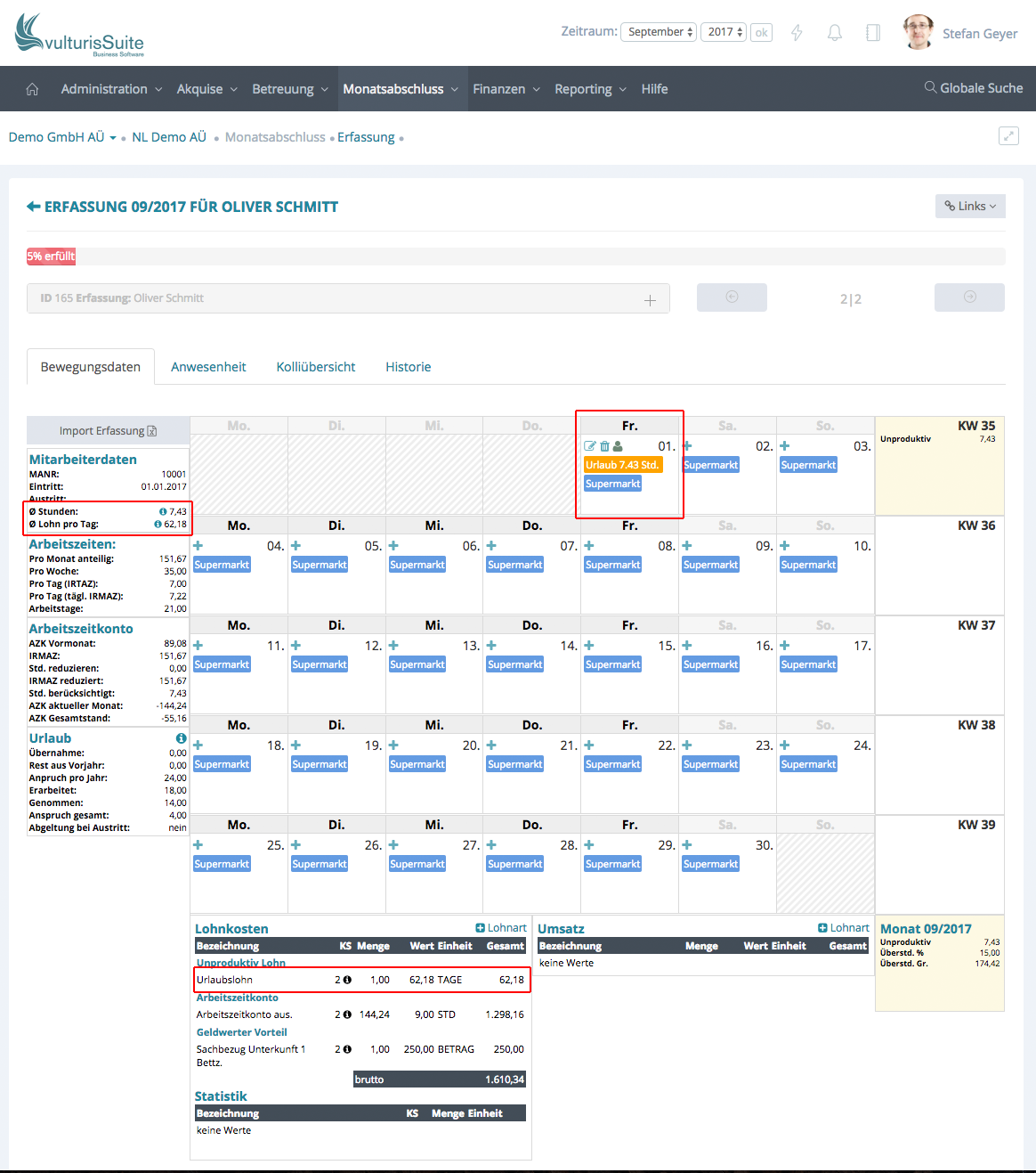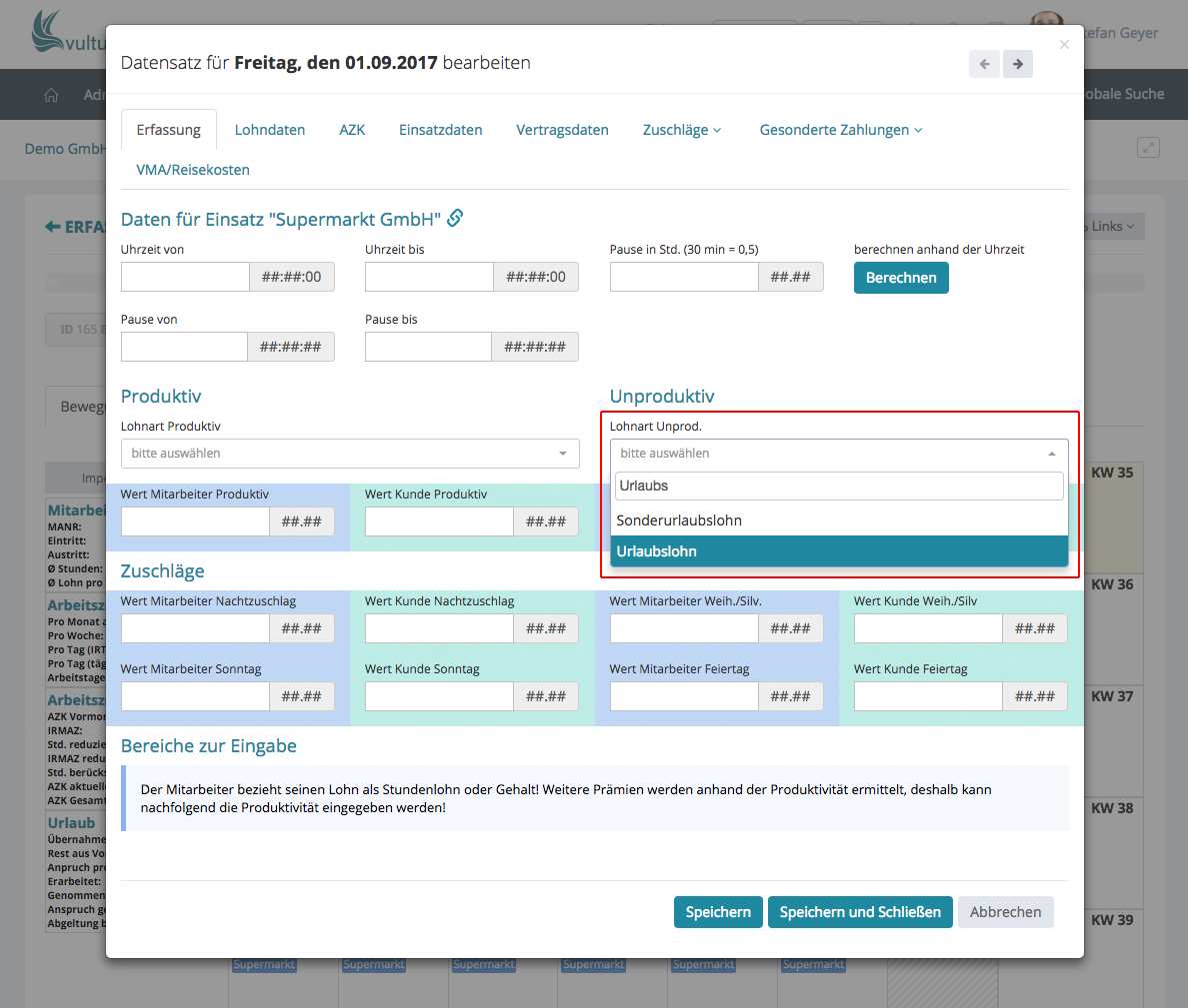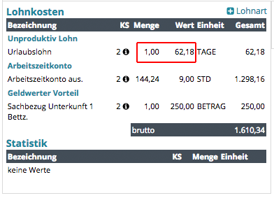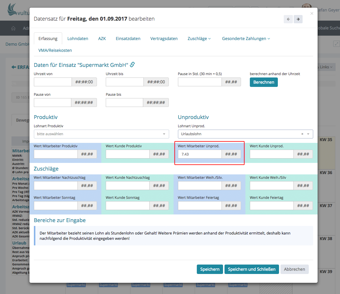 In diesem Beispiel sehen Sie, dass für die unproduktiven Stunden am Tag selbst der aktuelle Durchschnittswert des Mitarbeiters eingetragen wurde und als Tagessatz der aktuell gültige Durchschnittslohn pro Tag als Entgelt.