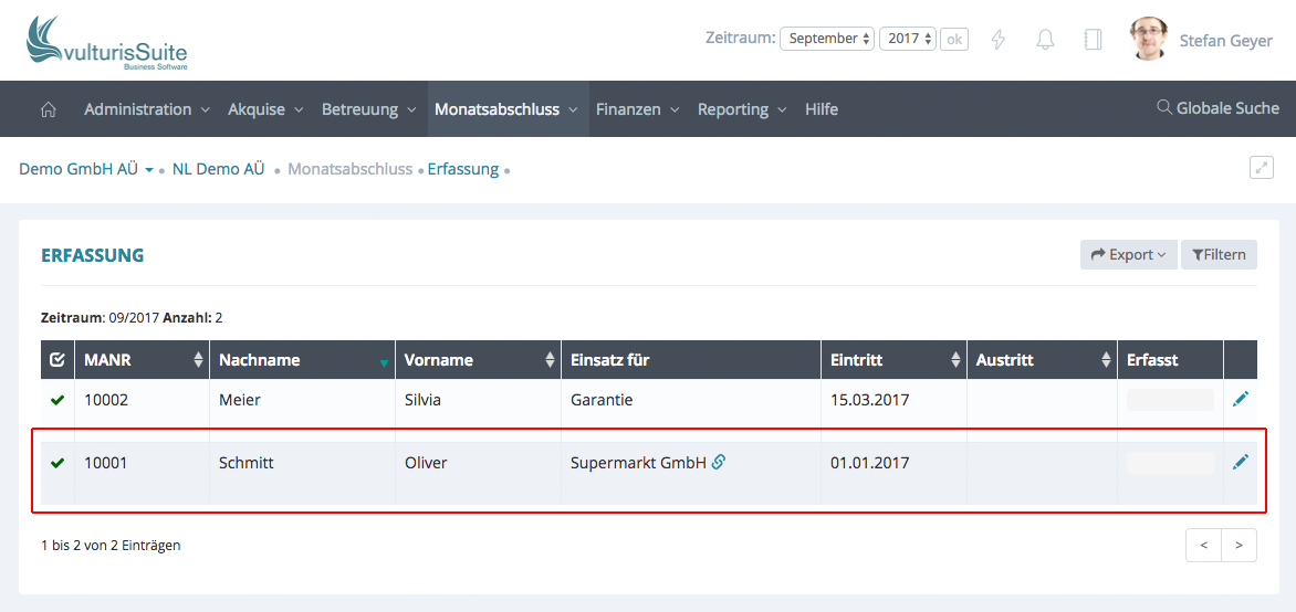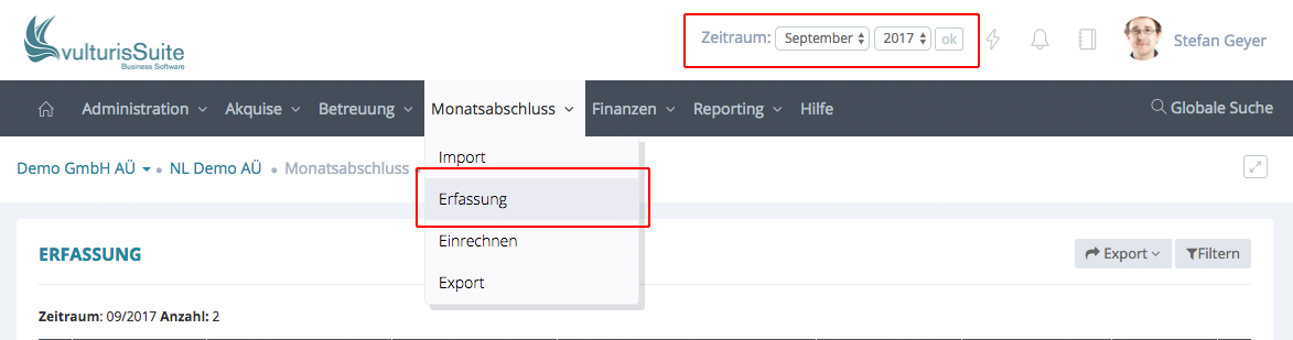 1. Wählen Sie oben im Hauptmenü – Monatsabschluss – Erfassung. Stellen Sie sicher ausserdem sicher, das oben der Abrechnungsmonat richtig eingestellt ist.