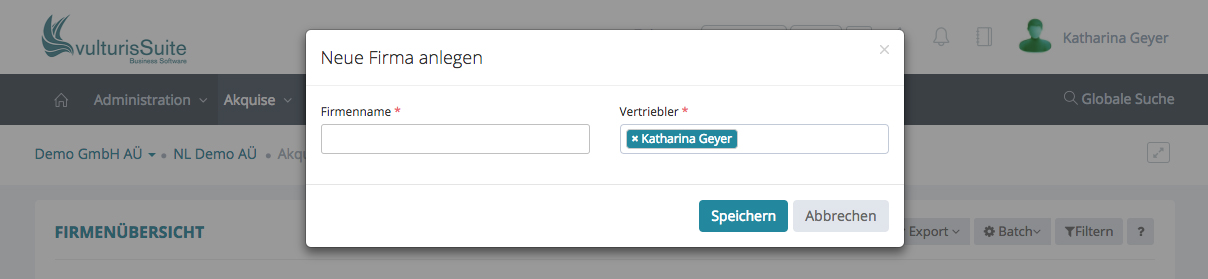 Ein Klick auf den Button „+ Firma“ und ein Schnelleingabefenster erscheint.