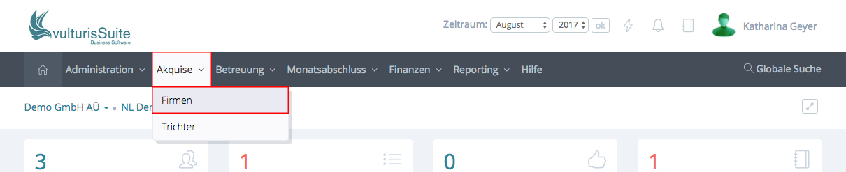 Um eine neue Firma anzulegen klicken Sie bitte in der Menüleiste auf Akquise -> Firma.